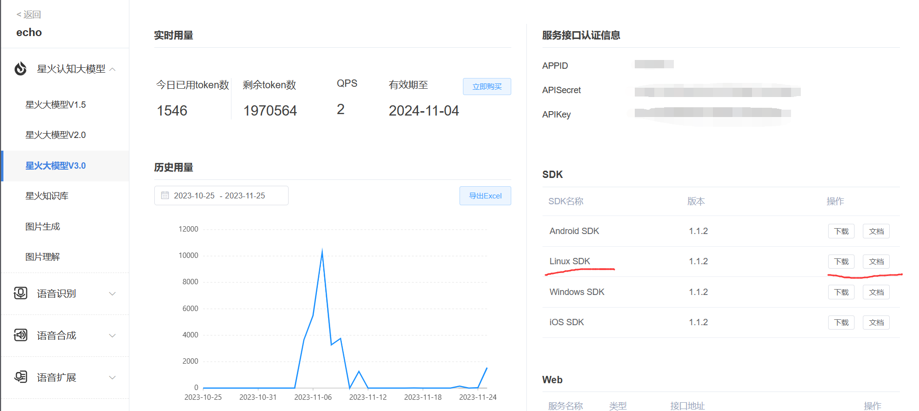 这里的 APPID 、APISecret 、APIKey 就是接口信息,后面会用到。